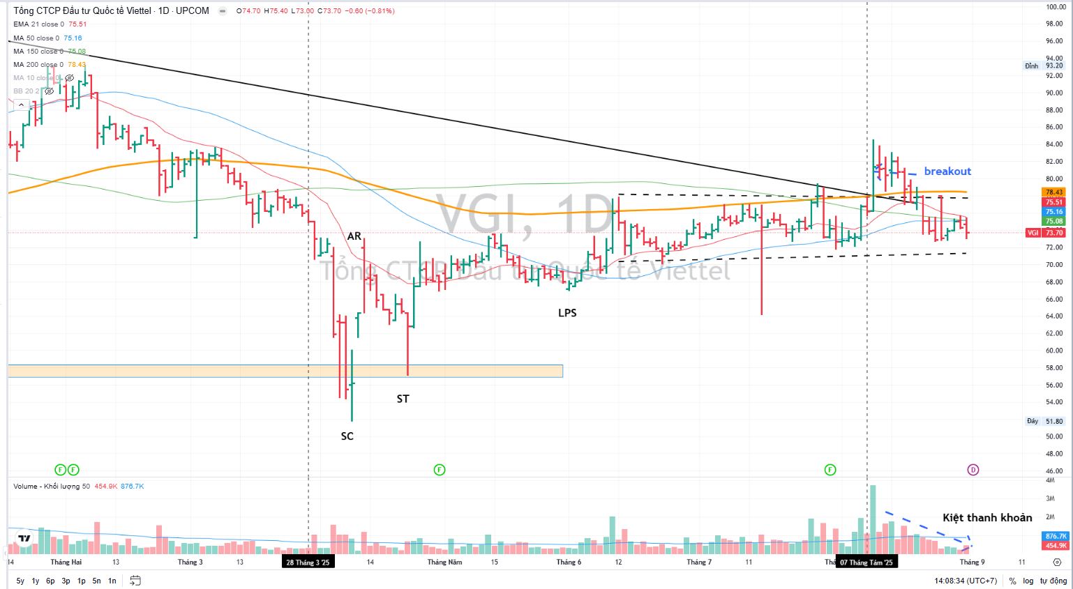 Vào ngày 8.8.2025, VGI breakout Nền Giá Phẳng và cũng breakout đường trendline giảm giá từ hơn 1 năm nay, nhưng sau đó nhanh chóng điều chỉnh về lại bên trong nền giá. Hiện VGI tiếp tục tích lũy quanh MA200 ngày, MA50 ngày với thanh khoản thấp cho thấy cung không còn nhiều, mở ra hy vọng tăng giá sau đó.