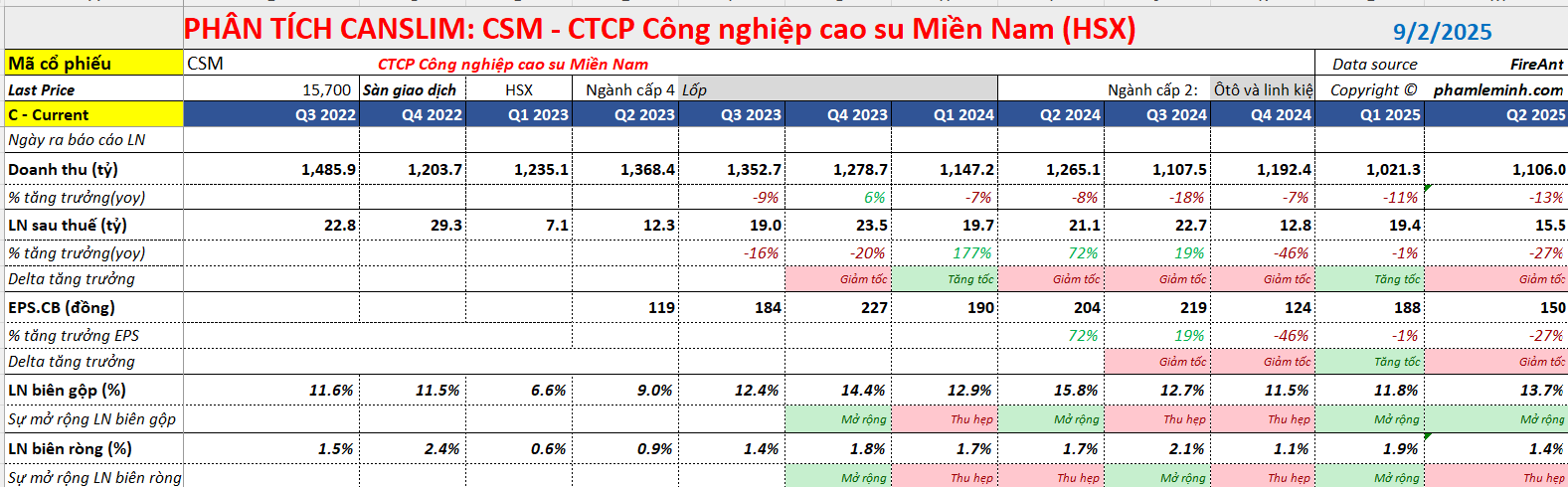 Lũy kế 6 tháng đầu năm 2025, doanh thu thuần và LNST-CĐTS của CSM lần lượt đạt 2.127 tỷ đồng (-12% so với cùng kỳ) và 35 tỷ đồng (-14% so với cùng kỳ).