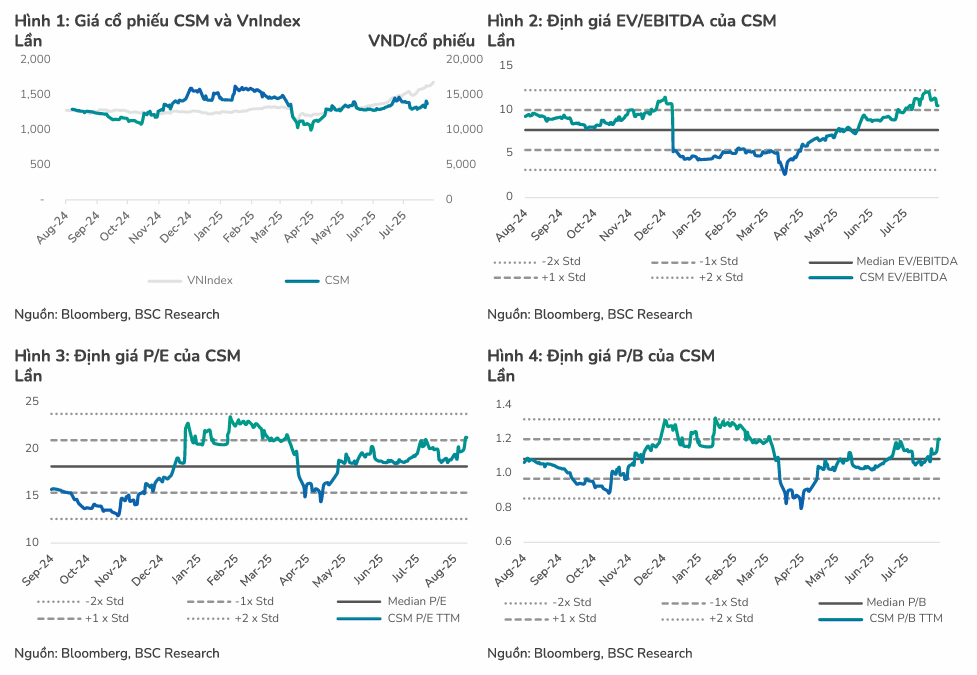 BSC (27.8.2025) khuyến nghị Nắm giữ đối với cổ phiếu CSM với giá mục tiêu 15,400 đồng/cổ phiếu, tương đương với giá hiện tại. Mức định giá này dựa trên P/B forward 2025 là 1.1x, tương đương với mức trung vị 5 năm.
