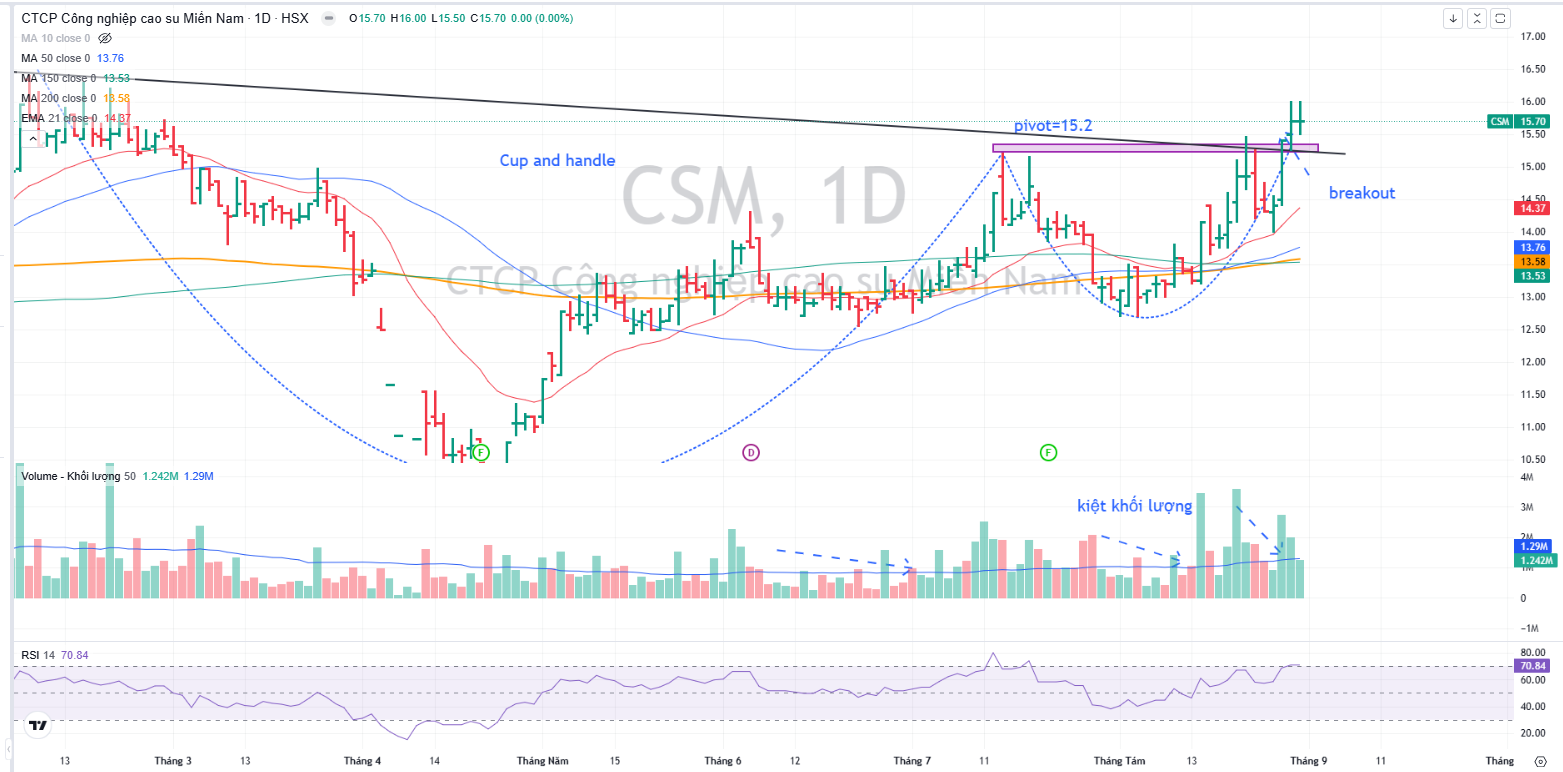 Trên đồ thị, CSM đã breakout mẫu hình Chiếc Cốc Tay Cầm, vượt qua điểm mua 15,200 đồng vào ngày 28.8.2025. Hiện nay CSM vẫn đang ở trong vùng mua hợp lý và các nhà giao dịch có thể tham gia giải ngân.