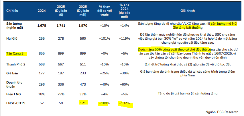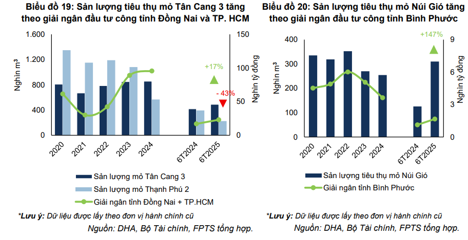 Nguyên nhân chủ yếu đến từ nhu cầu vật liệu tăng mạnh khi một số dự án hạ tầng trọng điểm được khởi công trong khu vực: cao tốc Gia Nghĩa – Chơn Thành và cao tốc TP.HCM – Thủ Dầu Một – Chơn Thành. Các dự án này đi qua Thị xã Chơn Thành, cách mỏ Núi Gió chỉ khoảng 20 km, tạo điều kiện thuận lợi cho tiêu thụ đá trong nửa đầu năm 2025. Sản lượng tiêu thụ mỏ Thạnh Phú 2 trong 6T2025 tiếp tục giảm 43% YoY, do vướng mắc pháp lý đến nay vẫn chưa được tháo gỡ, trong khi điều kiện địa chất khu vực biên phức tạp tiếp tục gây khó khăn cho hoạt động khai thác.