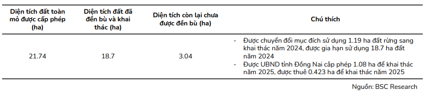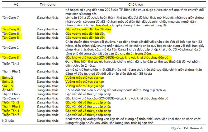 Thông tin từ Sở Nông nghiệp và Môi trường tỉnh Đồng Nai, đến 6T2025, tỉnh Đồng Nai (trước sáp nhập) có 32 giấy phép khai thác đá, công suất khai thác theo giấy phép đạt 22,7 triệu m3 /năm. Tuy nhiên, trong đó 25 mỏ đang vướng các thủ tục liên quan đến đền bù, thuê đất và chuyển nhượng quyền sử dụng đất; 5 mỏ đã hết hạn giấy phép khai thác. Điều này khiến nhiều mỏ hoạt động dưới 50% công suất thiết kế. Tiêu biểu, mỏ Tân Cang 7 và Tân Cang 9 chỉ hoạt động khoảng 30% công suất do 75 ha khai thác có tới 40% đất chưa hoàn thành thủ tục để khai thác. Mỏ Tân Cang 1 có hơn 20% diện tích khai thác chưa thuê được đất.