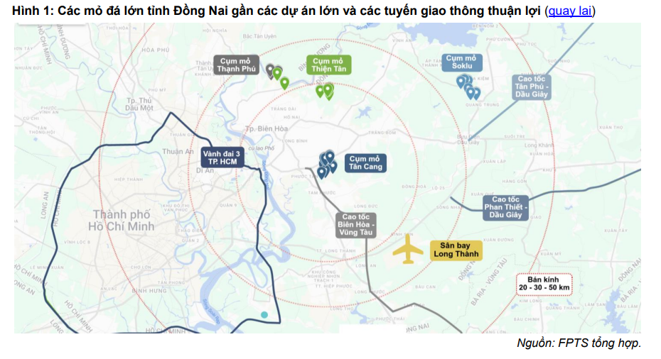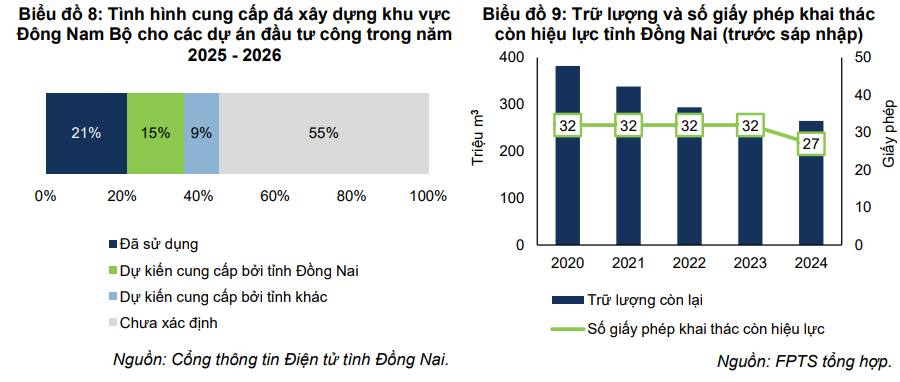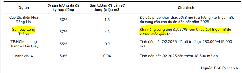 Theo FPTS, Tổng nhu cầu đá các loại cho các dự án đang tiến hành dự kiến hoàn thành trong năm 2025 và 2026 khoảng 21.6 triệu m3. . Tổng khối lượng đá đã đưa về công trường đến Q1/2025 là 4.6 triệu m3 (21%), khối lượng cần tiếp tục huy động là gần 17 triệu m3 . Trong khi mới chỉ xác định được nguồn hơn 5.2 triệu m3 (24%) nhiều nhất là ở tỉnh Đồng Nai 3.2 triệu m3 (15%), còn lại vẫn chưa xác định được nguồn.