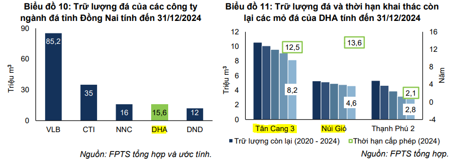 Tính đến cuối năm 2024, DHA sở hữu ba mỏ đá đang khai thác với tổng trữ lượng còn lại khoảng 15.6 triệu m³ đá nguyên khối. So với các doanh nghiệp cùng ngành trong khu vực, tổng trữ lượng đá còn lại của DHA xếp thứ 4 toàn tỉnh và thấp hơn nhiều so với VLB (hiện sở hữu khoảng 85.2 triệu m³) và CTI (khoảng 35 triệu m³), lần lượt gấp 5.5 lần và 2.2 lần trữ lượng đá của DHA. Tuy vậy, điểm hạn chế lớn nhất là về trữ lượng và thời hạn của mỏ Thạnh Phú 2, hai mỏ còn lại là Tân Cang 3 và Núi Gió vẫn sở hữu trữ lượng đủ lớn để duy trì hoạt động ổn định trong nhiều năm tới theo công suất hiện tại.