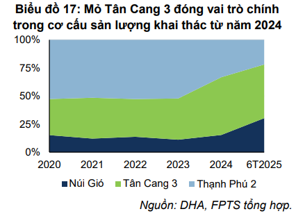 Từ năm 2024, cơ cấu sản lượng khai thác của DHA bắt đầu thay đổi khi tỷ trọng mỏ Tân Cang 3 và Núi Gió tăng lên. Đến 6T2025, Tân Cang 3 và Núi Gió chiếm lần lượt 48% và 30%, trong khi Thạnh Phú 2 giảm xuống còn khoảng 22%.