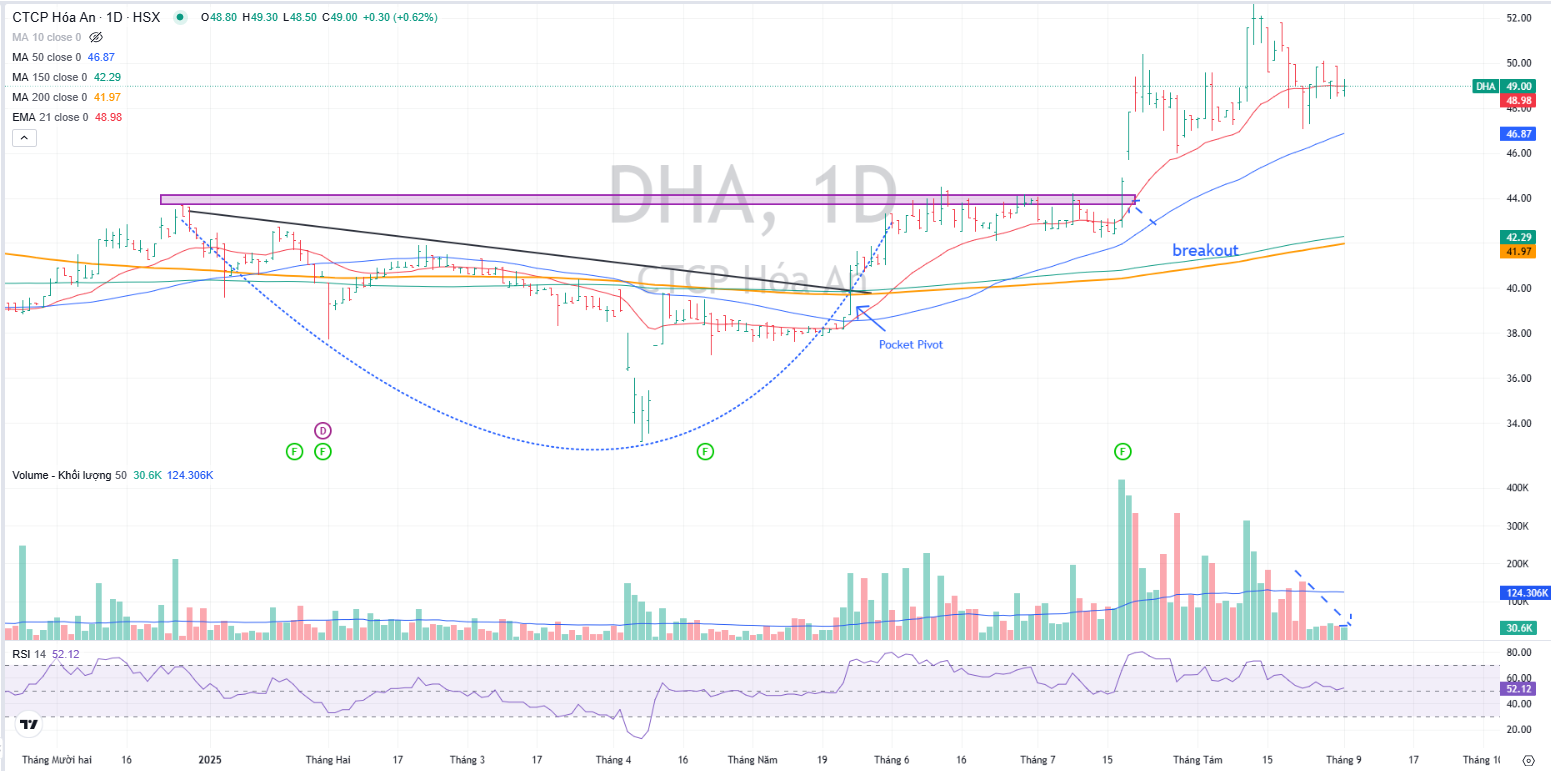 Trên đồ thị, RS của DHA là 75, hoạt động khá tốt trên thị trường. Sau khi breakout Chiếc Cốc Tay Cầm vào giữa tháng 7, DHA đang tìm hỗ trợ quanh EMA 21 ngày với thanh khoản thấp. MA50 ngày cũng đang dốc tăng lên, nằm bên dưới. Các nhà giao dịch chờ đợi sự tích lũy quanh MA50 ngày để có điểm mua đẹp hơn.