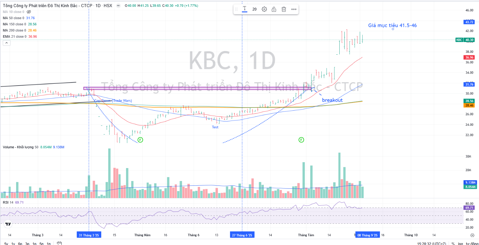 Vietcap (11.8.2025) điều chỉnh tăng 15% giá mục tiêu lên mức 41,500 đồng/cổ phiếu và duy trì khuyến nghị MUA đối với Tổng Công ty Phát triển Đô thị Kinh Bắc (KBC).
