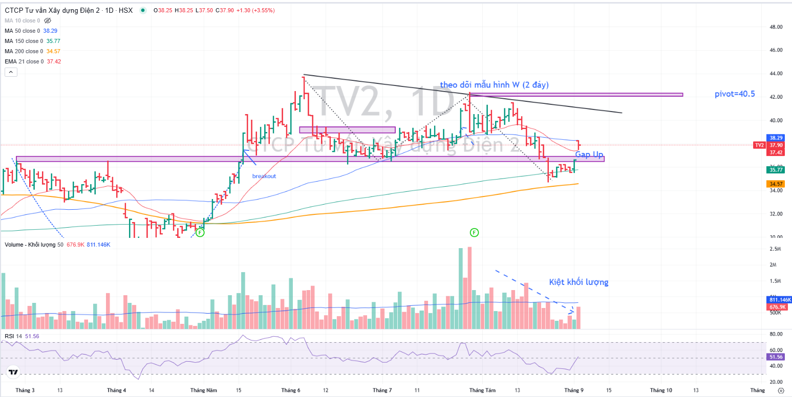 TV2 tăng hơn 3% với Gap Up đi kèm thanh khoản lớn sau thông tin lợi nhuận sau thuế tăng mạnh sau kiểm toán. Đây là điểm mua sớm bên trong nền giá Hai Đáy (W)