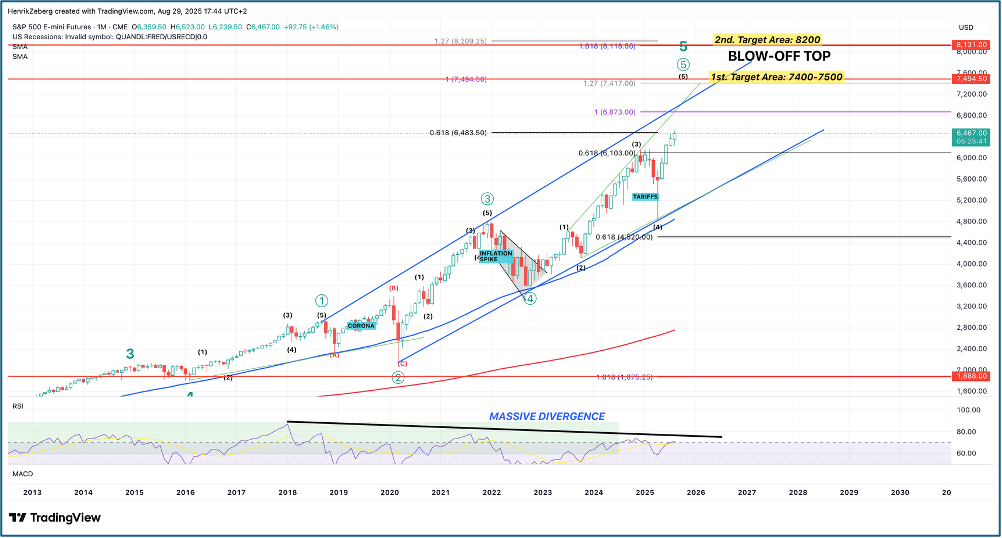 Đợt tăng giá đỉnh điểm (blow-off top) của SP500 đã bắt đầu. Nó có thể kéo dài rất xa trước khi đạt đỉnh cuối cùng kéo dài nhiều năm. Có những suy đoán rằng chỉ số S&P 500, hiện đang ở mức giữa 6,000 (tính đến tháng 8 năm 2025), có thể tăng vọt lên đâu đó trong khoảng 7,000–8,000 trong một cơn cuồng mua sắm cuối cùng. Đây không phải là một dự báo chính thống, nhưng một vài nhà phân tích táo bạo đã phác thảo các kịch bản trong đó S&P 500 có thể tăng vọt lên khoảng 7,500 hoặc thậm chí 8,100 trước một sự đảo chiều lớn – về cơ bản là một đợt tăng giá nóng chảy được thúc đẩy bởi FOMO (sợ bỏ lỡ) và sự điên rồ đầu cơ cuối cùng.