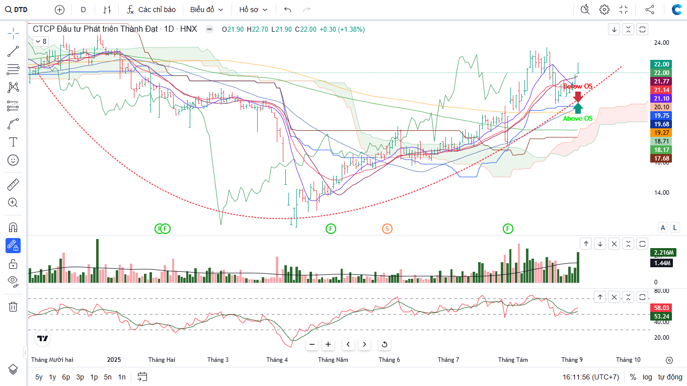 Trên biểu đồ kỹ thuật, DTD có RS=81.3, mức hoạt động tốt trên thị trường. Xét trong khung tuần, đường MA50 và MA200 xuất hiện Golden Cross dài hạn, giá liên tục retest và bật lên trên MA20/MA50 daily, hỗ trợ vững. Đám mây Ichimoku giữ giá trên Senkou Span, Tenkan-sen nằm trên Kijun-sen, và RSI quanh 58 vẫn trên ngưỡng 50, cho thấy dư địa tăng còn nhiều, quan sát hành động giá quanh 21.5-22.