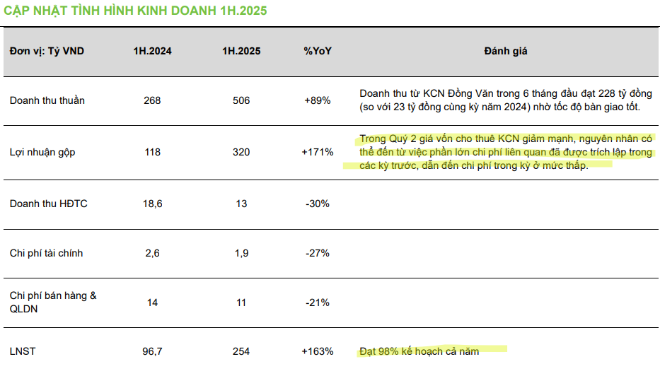 - Động lực chính đến từ doanh thu cho thuê khu công nghiệp Đồng Văn III đạt 228 tỷ đồng trong 6 tháng (so với 23 tỷ đồng cùng kỳ 2024). Giá vốn cho thuê khu công nghiệp giảm mạnh trong quý 2 do phần lớn chi phí đã được trích lập các kỳ trước.