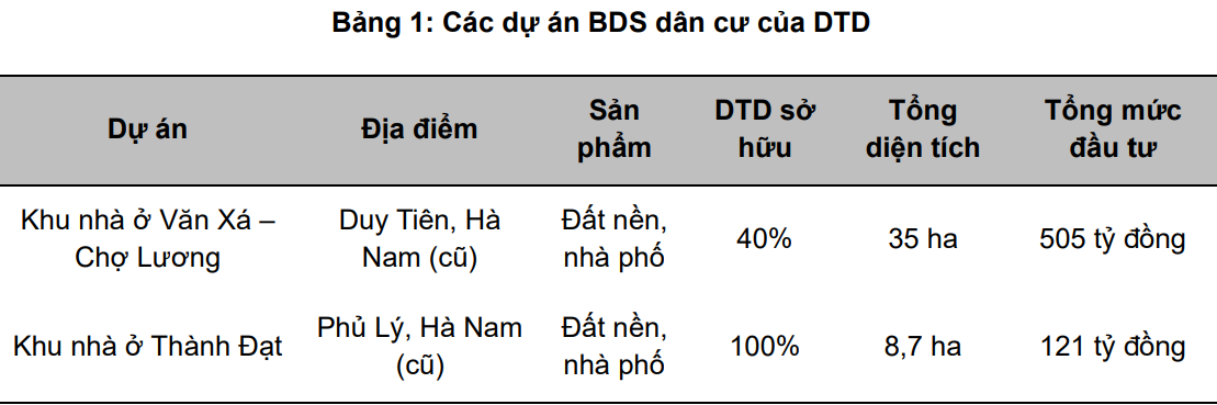 Cụ thể: Văn Xá – Chợ Lương (Duy Tiên, Hà Nam), sản phẩm đất nền – nhà phố, DTD sở hữu 40%, 35 ha, tổng mức đầu tư 505 tỷ đồng. Thành Đạt (Phủ Lý, Hà Nam), sản phẩm đất nền – nhà phố, DTD sở hữu 100%, 8.7 ha, tổng mức đầu tư 121 tỷ đồng.