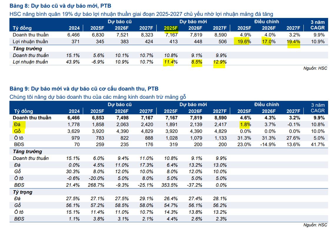 HSC dự báo doanh thu mảng gỗ của PTB sẽ tăng 1% so với cùng kỳ trong nửa cuối năm 2025, cho thấy doanh thu nửa cuối năm 2025 sẽ thấp hơn 9% so với nửa đầu năm 2025. HSC cho rằng tác động tiêu cực của áp lực thuế quan tiềm năng đã phần nào giảm bớt nhờ (i) tình hình kinh tế vĩ mô của Mỹ đang cải thiện khi lãi suất vay mua nhà giảm như dự kiến trong nửa cuối năm 2025, hỗ trợ nhu cầu nhà ở tăng mạnh hơn tại Mỹ và từ đó thúc đẩy doanh thu xuất khẩu đồ nội thất gỗ của PTB, và (ii) PTB đang đa dạng hóa thị trường xuất khẩu các dòng sản phẩm khác như viên gỗ nén sang Nhật Bản, Hàn Quốc và EU. Trong khi đó, PTB đang hỗ trợ khách hàng bằng cách giảm 5-7% chiết khấu giá bán bình quân. Điều này có thể sẽ ảnh hưởng đến tỷ suất lợi nhuận trong nửa cuối năm 2025, khi tỷ suất lợi nhuận gộp của mảng gỗ đã giảm xuống 19.2% trong Q2/2025 (so với 20.7% trong Q2/2024 và 21.8% trong Q1/2025)