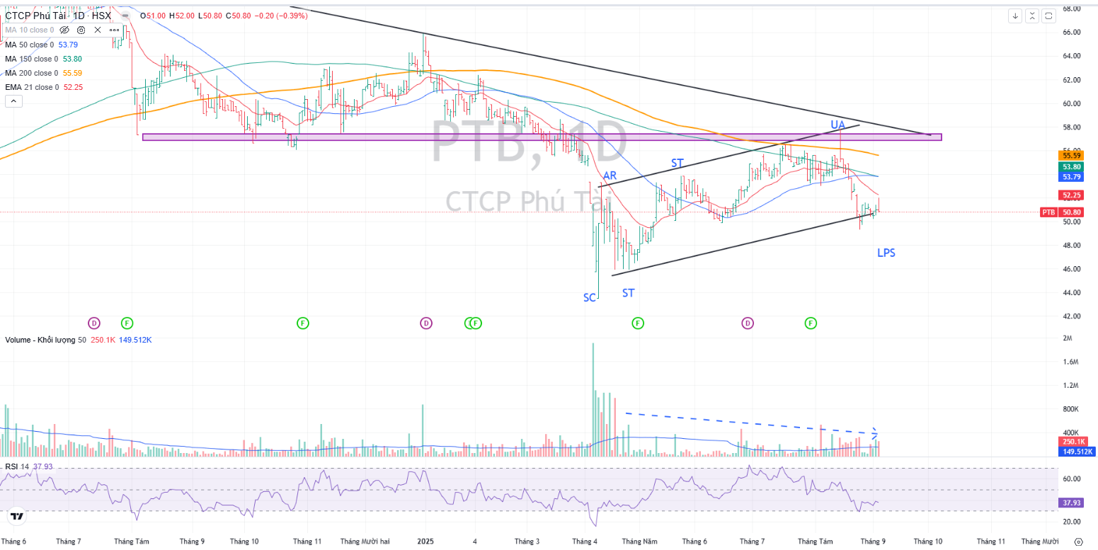 Sau khi bị kháng cự tại vùng giá 57,000 đồng, PTB đã thủng MA50 ngày, khả năng cổ phiếu phải tìm về hỗ trợ (LPS) thấp hơn ở vùng giá 46-48,000 đồng. Cổ phiếu này cần nhiều thời gian để xây lại nền giá, nên chưa phải là thời điểm để giao dịch.