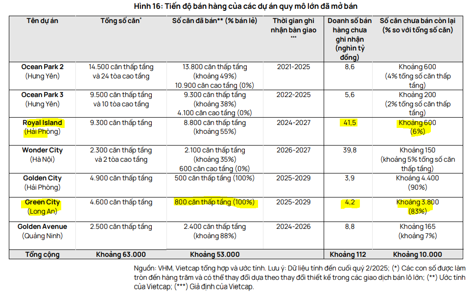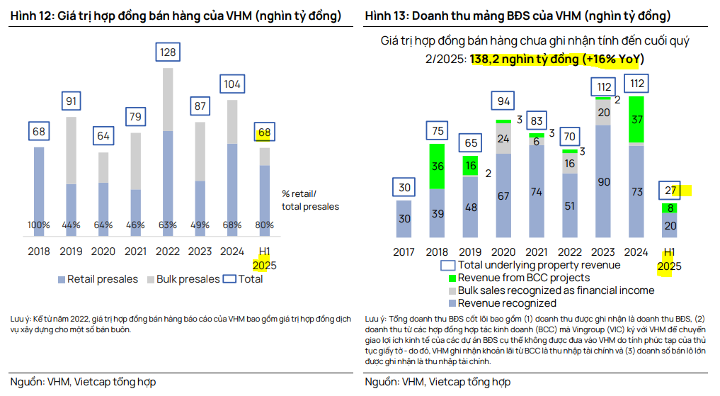 • VHM tăng trưởng vượt bậc nhờ mở bán sớm các dự án lớn như Cam Lâm, Làng Vân, doanh thu bất động sản nửa cuối 2025 dự kiến gấp 3 lần nửa đầu năm; giá trị hợp đồng chưa ghi nhận lên tới 138,200 tỷ đồng.