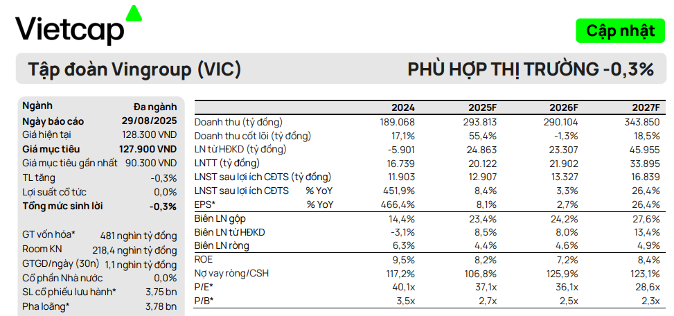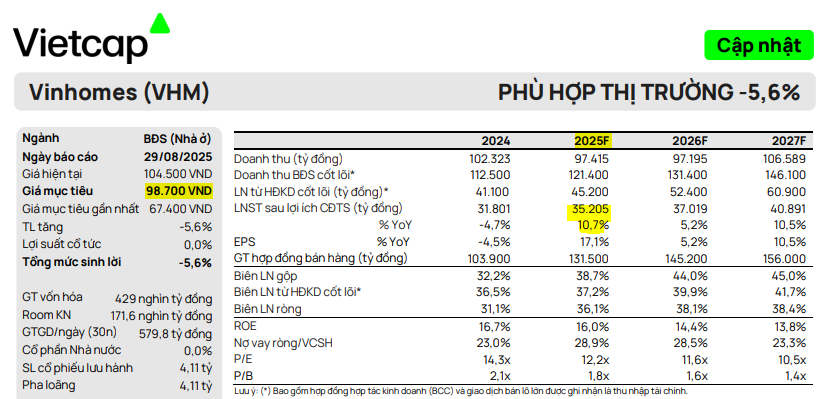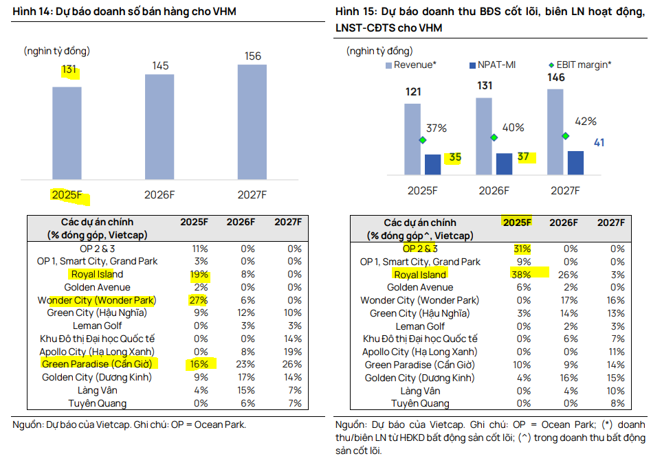 • Tăng trưởng doanh số và lợi nhuận: Dự báo tổng doanh số bán hàng giai đoạn 2025-2027 của VHM tăng thêm 17%, nhờ việc mở bán sớm hơn dự kiến các dự án như Làng VânGreen Paradise. Doanh thu bất động sản cốt lõi trong nửa cuối năm 2025 dự kiến cao gấp ba lần so với nửa đầu năm.
