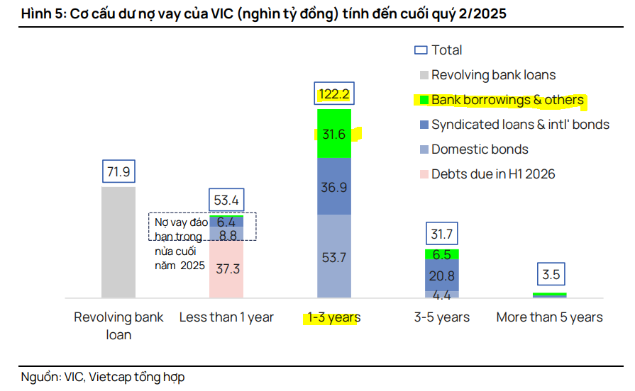 • Các khoản nợ vay đáo hạn trong nửa cuối năm 2025: 16,100 tỷ đồng. Cụ thể, trong số này, 8,800 tỷ đồng là trái phiếu trong nước và 6,400 tỷ đồng là khoản vay hợp vốn và trái phiếu quốc tế.