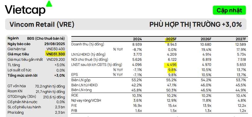 Vietcap hạ khuyến nghị đối với Vincom Retail (VRE) xuống “Phù hợp thị trường” mặc dù tăng giá mục tiêu thêm 7% lên 31,300 đồng/cổ phiếu. Như vậy, VRE đã chạm thị mục tiêu giá tại thời điểm đầu tháng 9.