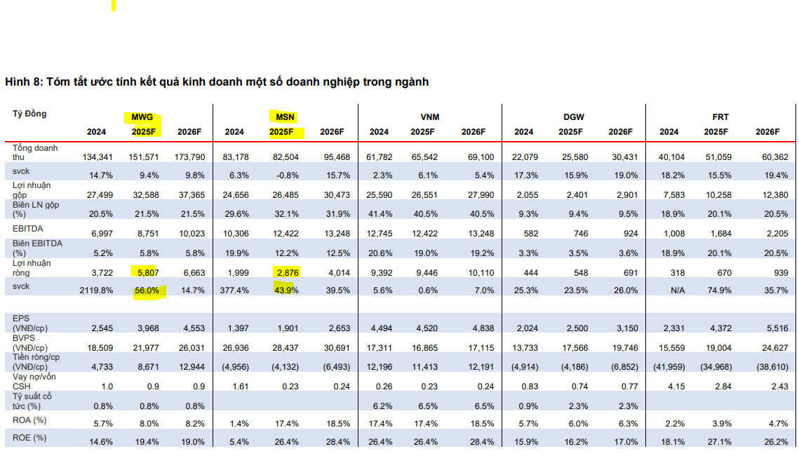 MBS khuyến nghị đầu tư vào MWG và MSN, với giá mục tiêu lần lượt 80,800đ và 98,000đ/cp; lợi nhuận ròng dự báo tăng mạnh: MWG +56%, MSN +44%, định giá vẫn hấp dẫn trong chu kỳ phục hồi của ngành bán lẻ