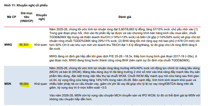 MWG: Với chuỗi Bách Hóa Xanh đã có lãi và đang trong giai đoạn mở rộng nhanh chóng, MBS đánh giá cao MWG nhờ tốc độ tăng trưởng thị phần vững vàng và định giá còn hấp dẫn so với các doanh nghiệp cùng ngành trong khu vực. Giá mục tiêu được MBS đưa ra là 80,800 đồng với lợi nhuận ròng tăng 56%, đạt 5,807 tỷ đồng. Trước đó, SSI (28.08.2025) nâng giá mục tiêu cho MWG lên 87,000 đồng/cp (từ 74,000), duy trì khuyến nghị MUA với tiềm năng upside là +16%.