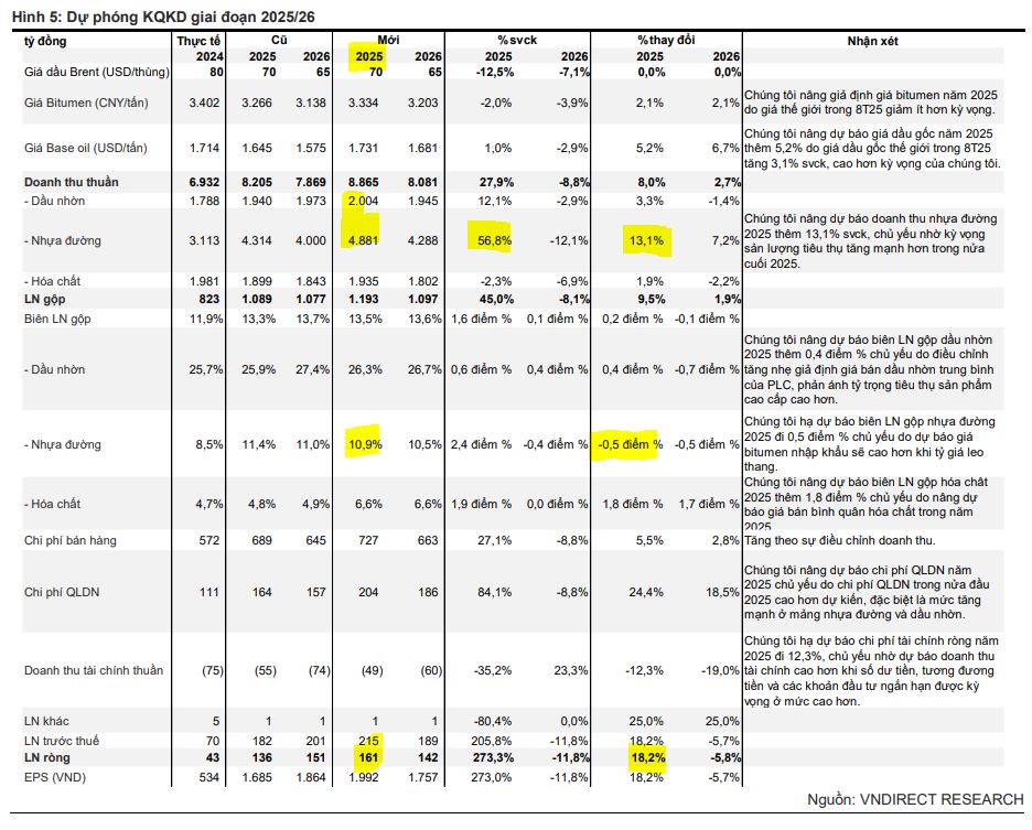 - Biên lợi nhuận cải thiện: Mặc dù giá đầu vào (bitumen nhập khẩu) tăng nhẹ, giá bán nhựa đường phục hồi nhờ nhu cầu cao sẽ giúp biên lợi nhuận gộp của mảng này mở rộng 2.4 điểm phần trăm lên 10.9% trong năm 2025.