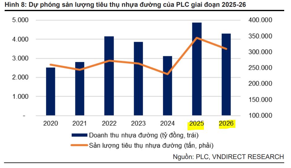 - Nhu cầu nhựa đường kỷ lục: Nhiều dự án cao tốc lớn đã hoàn thành hoặc đang bước vào giai đoạn thảm nhựa, thúc đẩy nhu cầu nhựa đường lên mức cao nhất từ trước đến nay. VNDirect nâng dự phóng sản lượng tiêu thụ nhựa đường của PLC năm 2025 lên 345 nghìn tấn, tăng 50% so với cùng kỳ.