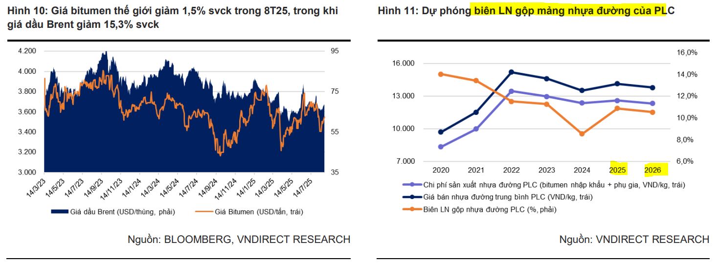 Mảng nhựa đường của PLC hưởng lợi mạnh từ đầu tư công, sản lượng tiêu thụ dự báo tăng 50% lên 345,000 tấn trong năm 2025; biên lợi nhuận gộp cải thiện lên 10.9% nhờ nhu cầu cao và giá bán phục hồi.