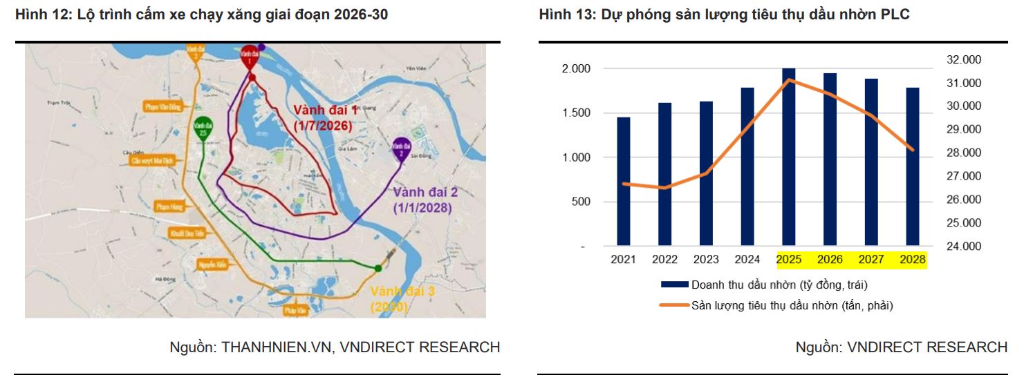 - Mảng dầu nhờn đối mặt rủi ro dài hạn do lộ trình cấm xe xăng, đặc biệt tại Hà Nội; tuy nhiên, tác động sẽ diễn ra từ từ nhờ mạng lưới phân phối rộng và độ trễ chính sách.