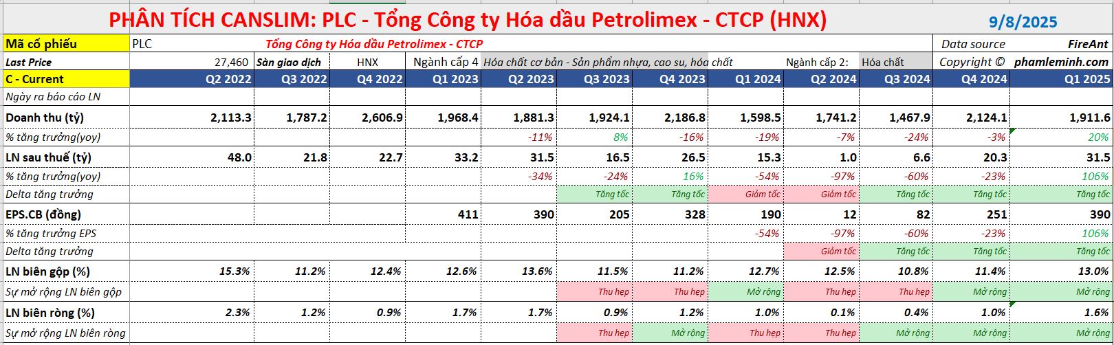 Trong mô hình CANSLIM, PLC đang có mẫu hình CODE 33. Theo đó, tăng trưởng doanh thu 3 quý gần nhất là -24%, -3% và +20% yoy. Tương ứng, tăng trưởng lợi nhuận trong cùng thời gian là -60% -23% và +106%. Biên lợi nhuận ròng mở rộng từ 0.4% lên 1.6%.