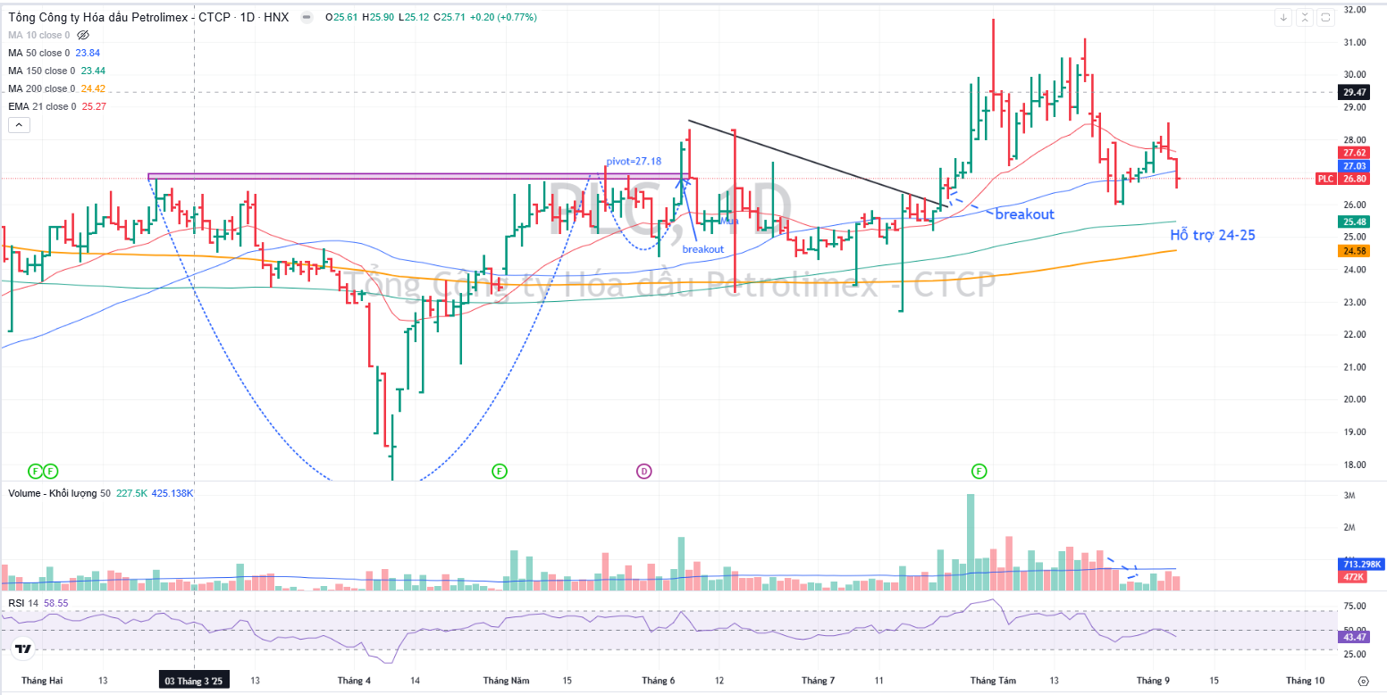 Sau khi breakout thất bại mẫu hình Chiếc Cốc Tay Cầm, PLC đang thoái lùi về MA50 ngày. Nếu thủng đường trung bình di động này để xây lai nền giá, PLC tìm thấy hỗ trợ mạnh ở MA150-MA200 ngày, là 24-25,000 đồng.