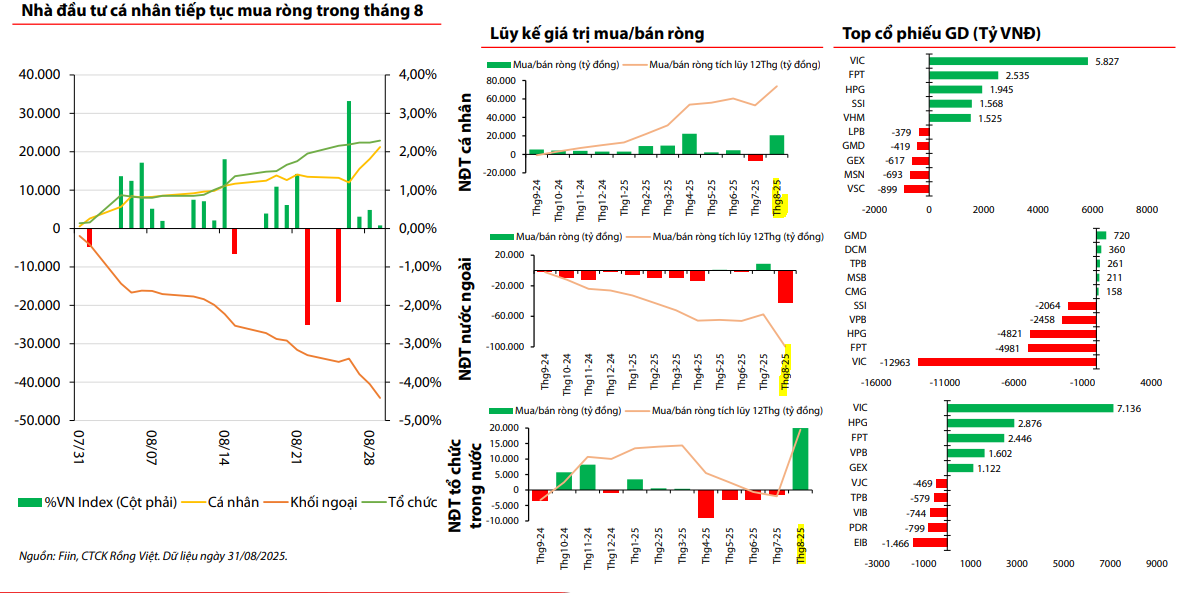 Một điểm đáng chú ý trong tháng 8 là sự đảo chiều của nhà đầu tư nước ngoài. Sau khi mua ròng trong tháng 7, khối ngoại đã bán ròng kỷ lục lên tới 42,200 tỷ đồng, chủ yếu thông qua khớp lệnh và thỏa thuận. Áp lực bán này tập trung vào các cổ phiếu đầu ngành như VIC (12,963 tỷ đồng), FPT (4,981 tỷ đồng) và HPG (4.821 tỷ đồng), do ảnh hưởng từ tỷ giá neo cao. Tuy nhiên, dòng tiền mạnh mẽ từ nhà đầu tư cá nhân và tổ chức trong nước đã hấp thụ tốt lượng bán ròng này, trở thành động lực chính dẫn dắt thị trường.