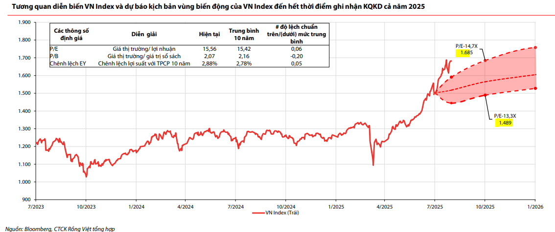 Trong ngắn hạn, VDSC nhận định dư địa tăng điểm của VN-Index không còn quá lớn do định giá đã tiệm cận vùng dự phóng cho nửa cuối năm 2025. Tuy nhiên, với thanh khoản dồi dào, thị trường có thể chứng kiến hiện tượng dòng tiền luân chuyển giữa các nhóm ngành và cổ phiếu.