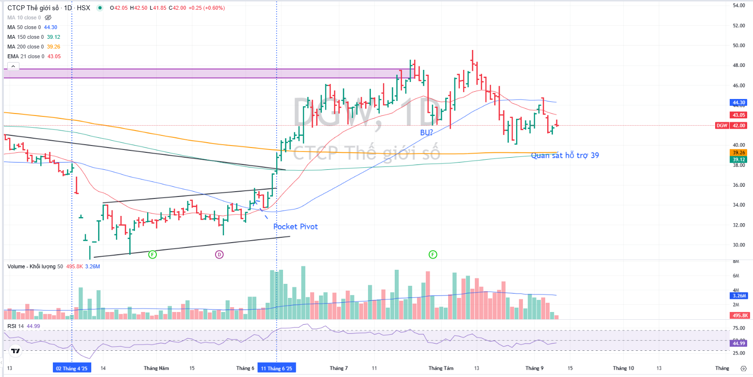DGW đang nằm dưới MA50 ngày và đang xây lại nền giá. Quan sát hỗ trợ giá cổ phiếu ở các MA200 ngày là 39,000 đồng.