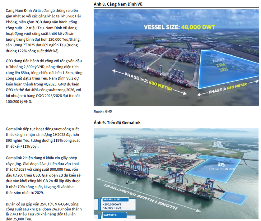 GMD dự kiến sản lượng hàng qua cảng sẽ tăng trưởng 6.4% trong năm 2025 và 3.4% trong năm 2026. Động lực chính đến từ cảng Nam Đình Vũ 3 đi vào hoạt động vào cuối năm 2025, tập trung vào nhóm hàng siêu trường siêu trọng (OOG), một phân khúc có tính cạnh tranh cao.