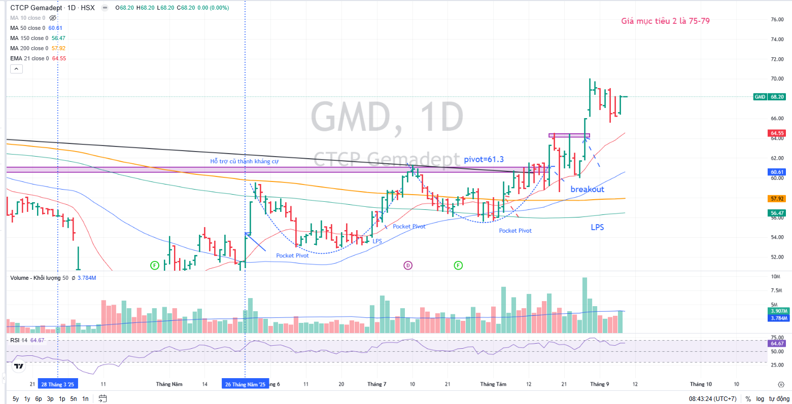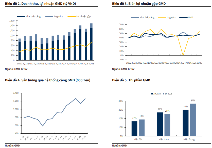 KBSV (9.9.2025) duy trì khuyến nghị MUA đối với cổ phiếu GMD với giá mục tiêu 79,800 VND/cổ phiếu, cao hơn 20,2% so với giá đóng cửa ngày 08/09/2025. Mức giá mục tiêu này được điều chỉnh tăng sau khi đánh giá lại tác động của thuế quan mới của Mỹ và triển vọng tích cực của các cảng biển GMD.