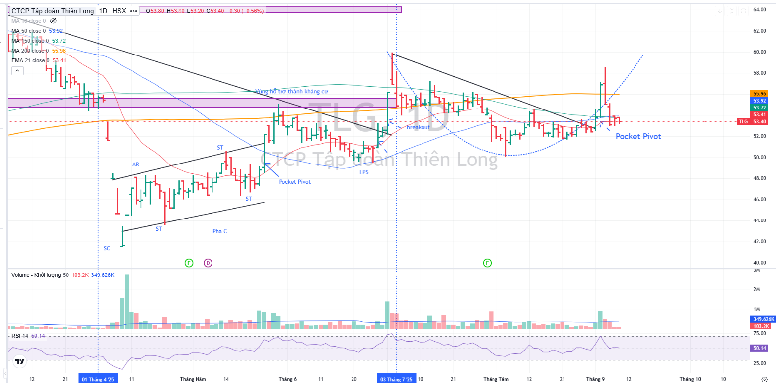 Sau khi có điểm mua Pocket Pivot và breakout đường trendline vào ngày 8.9.2025, cổ phiếu TLG đang kiểm tra lại điểm mua này, và tích lũy quanh MA50 ngày. Điểm mua vẫn tiếp tục còn hiệu lực.