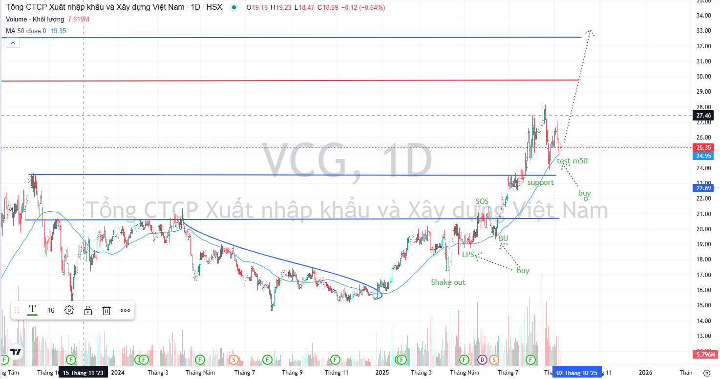 Trên đồ thị kỹ thuật, VCG đang test MA50 với thanh khoản thấp , nhà đầu tư có thể mua ở vùng giá 24.5-25.5k cho mục tiêu giá 34k.