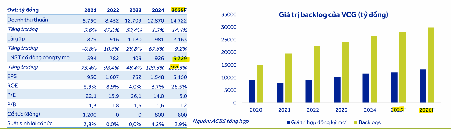 VCG được kỳ vọng hưởng lợi lớn từ đầu tư công khi backlog Q2/2025 đạt hơn 27,700 tỷ đồng, gấp gần 3 lần doanh thu xây lắp 2024. Đây là nền tảng giúp doanh thu và lợi nhuận tăng mạnh giai đoạn 2025–2026. Ngoài ra, thị trường bất động sản dân dụng và nghỉ dưỡng dự kiến phục hồi từ 2025, tạo động lực tăng trưởng cho VCG giai đoạn 2026–2027. Doanh nghiệp đã thoái 51% vốn dự án Cát Bà Amatina (172 ha), mang lại lợi nhuận đột biến, qua đó ACBS nâng dự phóng LNST 2025 lên 3,329 tỷ đồng (+260% YoY), doanh thu giữ nguyên ở mức 14,722 tỷ đồng (+14,4% YoY). Giá mục tiêu được điều chỉnh lên 34,100 đồng/cp, duy trì khuyến nghị MUA.