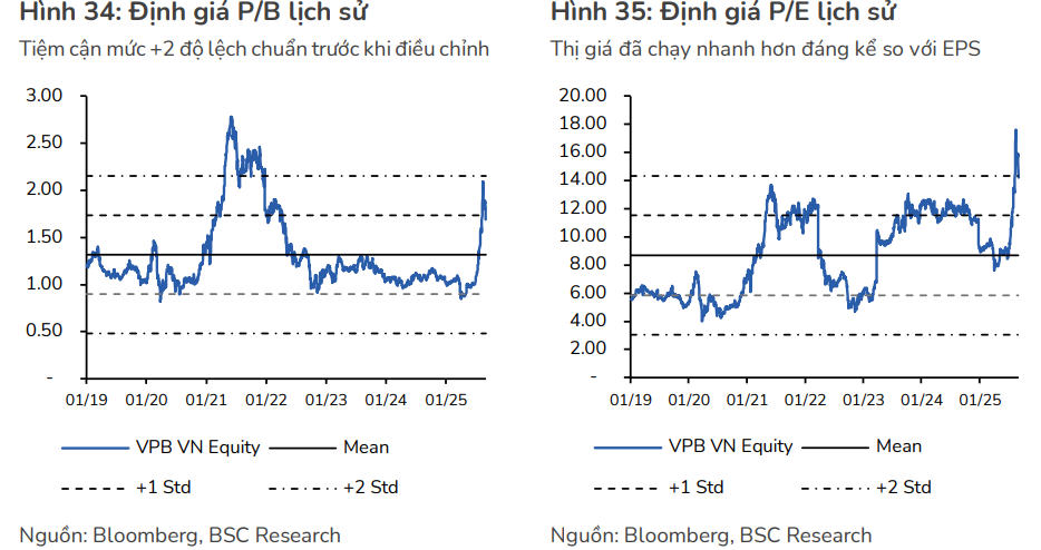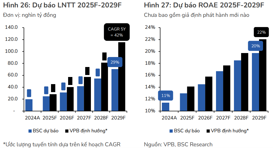 BSC (09.09.2025) khuyến nghị NẮM GIỮ với VPB dựa trên giá mục tiêu mới nhất là 35,600 đồng/cp (upside 14% so với giá đóng cửa 08/09/2025) trong kịch bản cơ sở với CAGR 2025F2029F được dự báo ở mức 27%/năm, điều chỉnh tăng so với mức 21%/năm trước đó chủ yếu nhờ dự báo tăng trưởng tín dụng (riêng lẻ) được đẩy lên trung bình 28%/năm trong khi chi phí tín dụng lẫn tỷ lệ xử lý nợ được kỳ vọng giảm xuống 1 mặt bằng mới.
