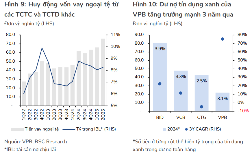 Bối cảnh chính sách hỗ trợ (Vietnam Green Taxonomy theo QĐ 21/2025/QĐ-TTg ban hành 04/07/2025, và Nghị quyết 198/2025/QH15 hỗ trợ lãi suất 2%/năm cho dự án xanh) tạo thêm lợi thế huy động vốn xanh, thường không cần TSBĐ, được bảo lãnh bởi tổ chức quốc tế, lãi suất thấp và kỳ hạn dài. VPB đã xây dựng khung tín dụng xanh/khung tài chính xã hội/bền vững, sẵn sàng đón đầu nhu cầu chuyển đổi của doanh nghiệp, qua đó duy trì cửa huy động vốn quốc tế.