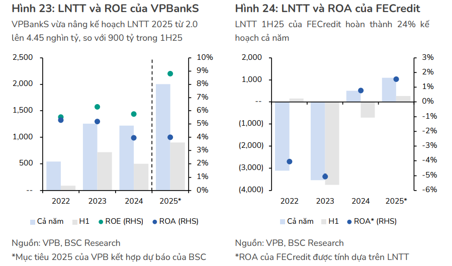 FECredit và VPBankS đều cải thiện lợi nhuận trong 1H/2025, lần lượt 267 tỷ đồng (so với lỗ 707 tỷ cùng kỳ) và 900 tỷ đồng (+80% YoY) so với kế hoạch năm tương ứng 1.1 nghìn tỷ và 2.0 nghìn tỷ. VPBankS sau các đợt tăng vốn 2022–2024 đã nâng cho vay margin gần 17.8 nghìn tỷ, chiếm khoảng 2.6% thị phần, Top 4 toàn ngành, trong khi đòn bẩy (dư nợ/VCSH) chỉ xấp xỉ 1.0x. SMBC đã cho vay mới là 3.9 nghìn tỷ cho VPBankS trong 1H/2025, củng cố nền tảng tăng trưởng và giảm chi phí vốn.