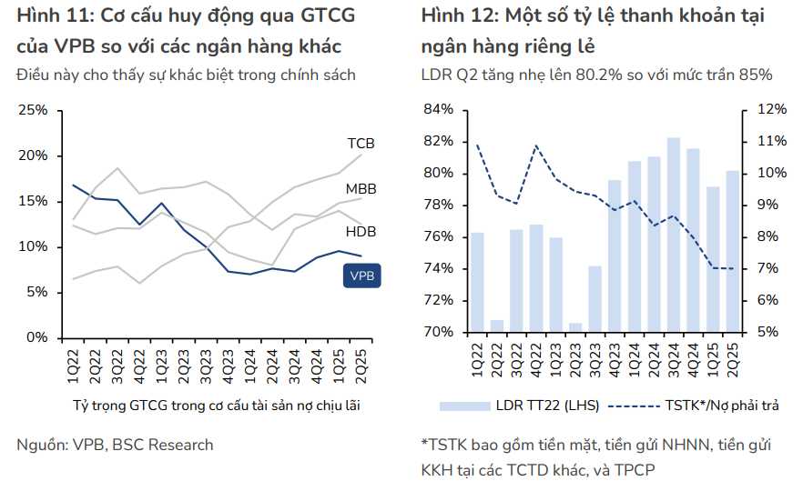 Song LDR vẫn là bài toán khó. Theo BSC, VPB là ngân hàng đề xuất NHNN nới trần LDR trong cuộc họp đầu 08/2025, điều vốn thường thấy ở khối quốc doanh, do đặc thù tiền vay quốc tế (không được tính vào mẫu số LDR) và tỷ trọng GTCG trong cơ cấu huy động thấp hơn đối thủ. CAR hợp nhất của VPB cuối Q2/2025 đạt 13.8%, tiệm cận nhóm đầu ngành, tạo dư địa tăng tín dụng nếu nút thắt LDR được xử lý.