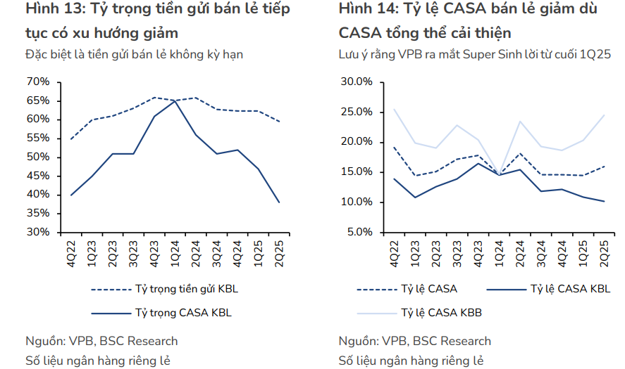 Về huy động không kỳ hạn, CASA ngân hàng mẹ nhích lên mức 16% cuối Q2 (tăng 1.5 điểm % QoQ), nhưng CASA bán lẻ theo ước tính của BSC giảm, dù VPB đang đẩy mạnh sản phẩm Super Sinh Lời ra mắt cuối 03/2025. Điều này cho thấy CASA hiện nghiêng về bán buôn, trong khi bán lẻ còn cần thời gian kích hoạt lại hành vi gửi tiền thanh toán.