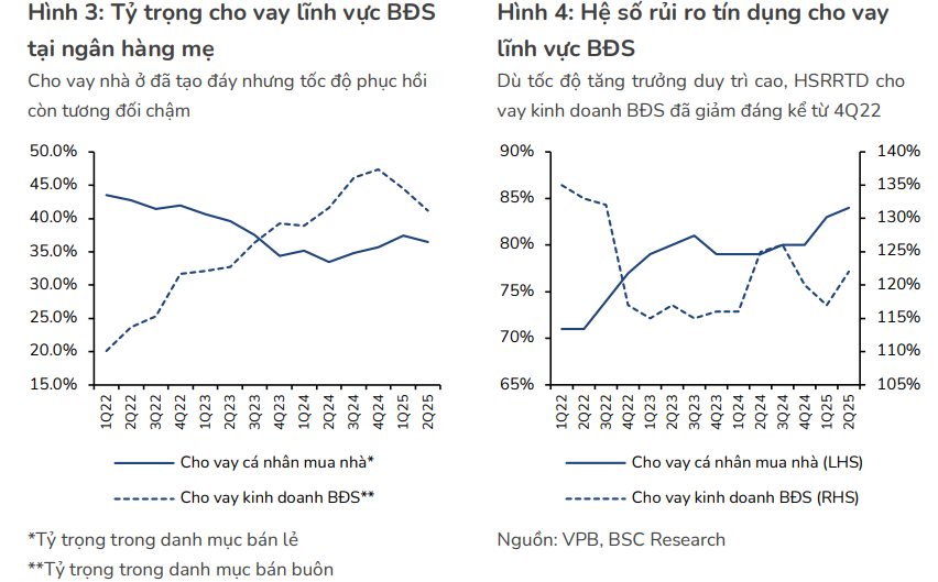 Tăng trưởng tín dụng tiếp tục xoay quanh phân khúc bán buôn. Sau 1H/2025, danh mục cho vay bán buôn của ngân hàng mẹ đạt khoảng 452 nghìn tỷ đồng (+28% YoY), vượt lên trên danh mục bán lẻ 298 nghìn tỷ đồng (+13% YoY). Tỷ trọng cho vay kinh doanh BĐS trong bán buôn đã giảm từ đỉnh 47.4% cuối 2024 xuống 41.2% tại Q2/2025—một phần do nền tăng mạnh năm ngoái. BSC ước tính lĩnh vực này đóng góp khoảng 19% vào tăng dư nợ bán buôn 1H/2025 (so với mức 66% cho cả năm 2024), phản ánh chủ đích đa dạng hóa và giảm rủi ro tập trung vào BĐS.