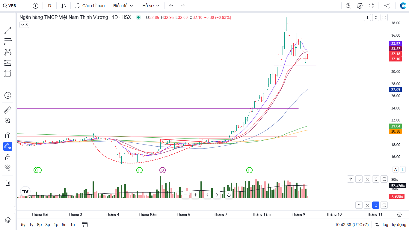 Trên biểu đồ kỹ thuật, VPB có RS=97, mức hoạt động tốt trên thị trường. VPB đã có cú chạy mạnh từ đáy tháng 4, tăng 156%, chỉ mất vọn vẹn 4 tháng (tính ở đỉnh 21/8), giá hiện tại của VPB đã phản ánh gần như tất cả kỳ vọng của thị trường về cổ phiếu.