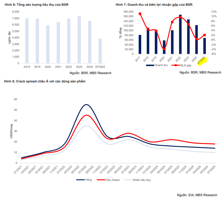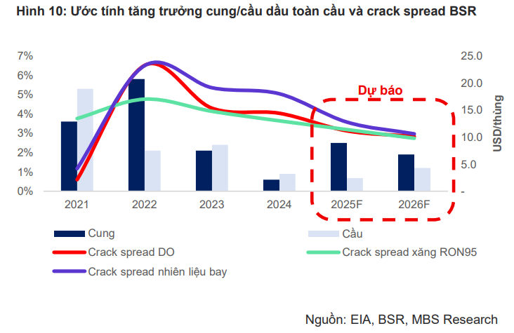 - Chuyển dịch cơ cấu sản phẩm: BSR đang chuyển dịch sang các sản phẩm hóa dầu có giá trị cao hơn như xăng RON95, Jet A1 và LPG, giúp cải thiện biên lợi nhuận gộp. GĐ 2025-2026, MBS dự báo crack spread xăng lần lượt giảm -12.4%/-14.2% svck và Crack spread dầu diesel giảm -22.5%/-9.3% svck. Dự kiến crack spread cuối 2025 với Diesel/RON95/Jet A1 lần lượt là 11.6/13.8/12.7 USD/thùng; bình quân cả năm 2025 tương ứng 11.2/11.4/12.8 USD/thùng
