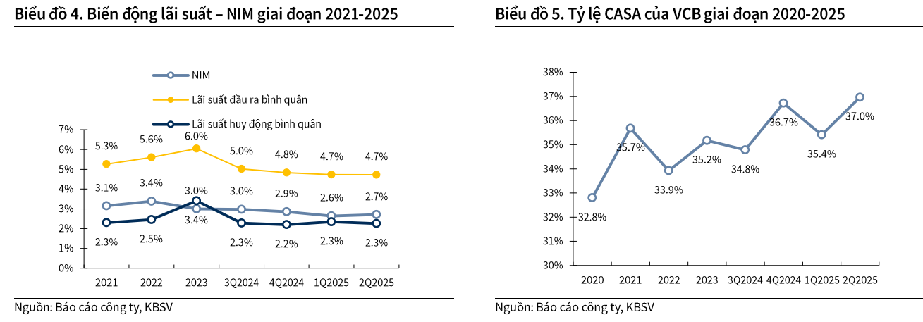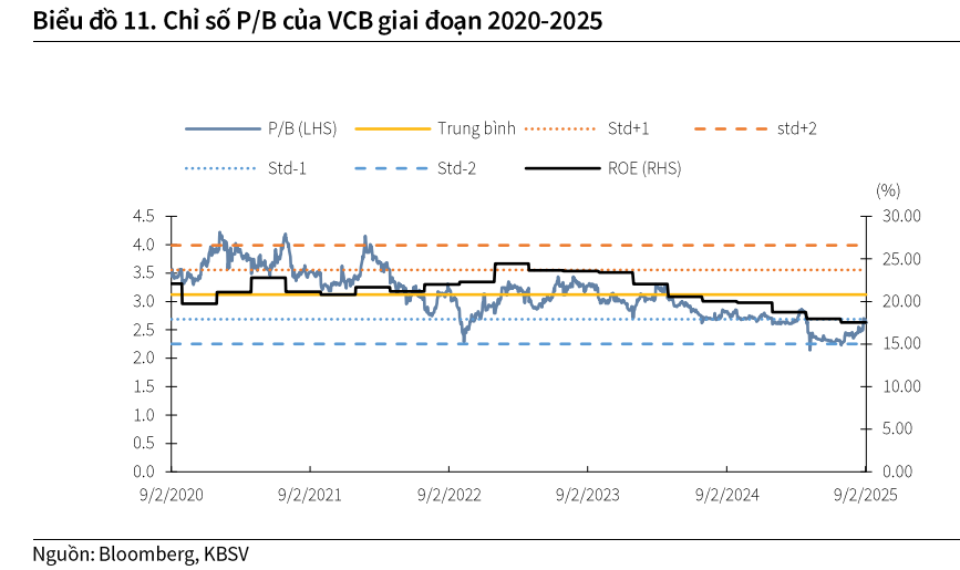 KBSV (8.9.2025) duy trì khuyến nghị MUA cho VCB với giá mục tiêu 77,800 đồng/cp (upside 19.1% so với 65,300 đồng/cp)
