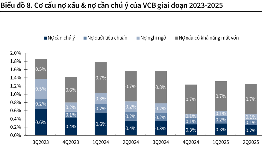 Chất lượng tài sản “đầu bảng” với NPL 1.00%, nợ nhóm 2 = 0.25%, LLCR 213.8%, dự phòng lũy kế ~33.3 nghìn tỷ đồng → áp lực trích lập nửa cuối năm không lớn.