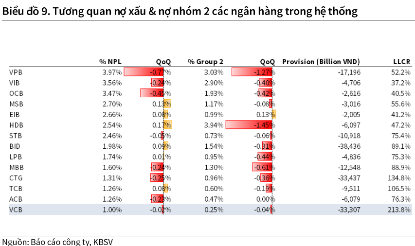 NIM 2Q2025 = 2.70% (QoQ -15 bps, YoY -28 bps), phản ánh lãi suất đầu ra bình quân 4.72% (QoQ -17 bps, YoY -79 bps) giảm nhanh hơn lãi suất đầu vào bình quân 2.26% (QoQ -3 bps, YoY -56 bps). KBSV đánh giá 2H2025 NIM tiếp tục chịu sức ép, chủ yếu từ rủi ro tăng lãi suất huy động tối thiểu 50 bps để giữ ổn định tỷ giá và thanh khoản hệ thống. Một số yếu tố hỗ trợ NIM trong 2H2025 bao gồm: (1) Sự hỗ trợ thanh khoản từ SBV; (2) Giảm tỷ lệ sở hữu bắt buộc; (3) Casa duy trì mức cao.