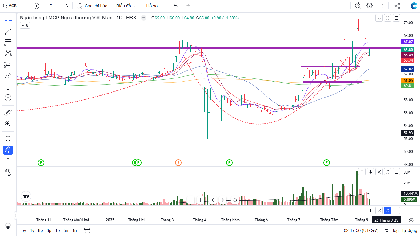 Trên biểu đồ kỹ thuật, VCB có RS=76.7, mức hoạt động tương đối tốt trên thị trường. Trong phiên hôm qua, VCB đã tìm hỗ trợ ở quanh EMA21, với thanh khoản khá thấp để test cung sau khi rũ dưới đường trung bình. Trước đó, VCB đã có phiên breakout vùng đỉnh lịch sử bằng 1 cây trần, tuy nhiên, thị trường hiện tại không thuận lợi để cổ phiếu có thể breakout thành công. Khả năng cao nhóm ngân hàng phải xây lại nền giá sau khi có nhịp tăng mạnh từ đáy tháng 4 năm 2025.